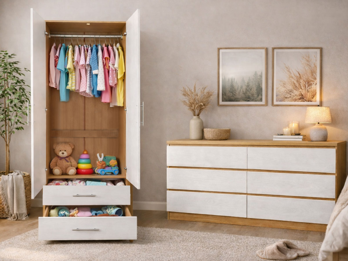 Este roupeiro inclui; 2 portas, 2 gavetas e 1 prateleira.
